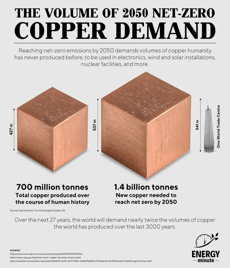 در طول تاریخ بشر، ما ۷۰۰ میلیون تن مس تولید کردهایم. برای رسیدن به انتشار خالص صفر کربن تا سال ۲۰۵۰، باید طی ۲۷ سال آینده ۱.۴ میلیارد تن مس تولید کنیم. دو برابر کردن کل تولید تاریخ بشر در کمتر از ۳ دهه.