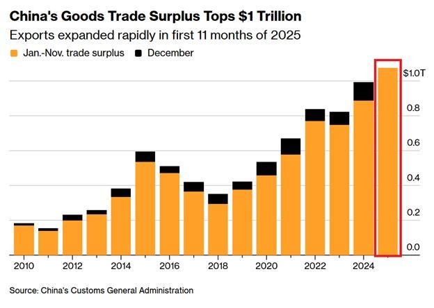 مازاد تجارت کالایی چین در ۱۱ ماه نخست سال ۲۰۲۵ با رشد ۲۱ درصدی نسبت به سال قبل، به رکورد ۱.۱ تریلیون دلار رسید.این رقم از رکورد سالانهٔ قبلی که ۹۹۰ میلیارد دلار بود نیز فراتر رفته است.